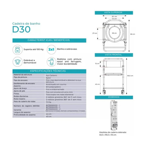 • Versatilidade 2 em 1: Desfrute da funcionalidade dupla, utilizando-a tanto para o banho quanto como cadeira sanitária sobre o vaso. Dessa forma, a D30 otimiza o espaço e a praticidade em sua rotina.