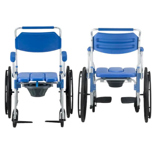 Cadeira de banho Dellamed D65 em alumínio, com rodas grandes e assento de 44cm. Suporta até 150kg, 4 em 1 (banho, transporte, sobrevaso, higiene).