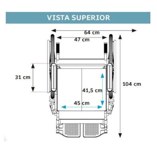 - Conforto: Assento com 45 x 41,5cm e almofada de 5cm, encosto tensionável, apoios de braço escamoteáveis;